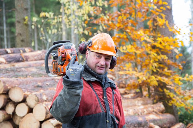 Zuständig für den großen Harvester. Er fällt, durchforstet und schafft Platz. Kein Steilhang hält ihn auf.
